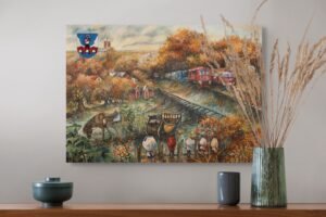 Paveiksle atsiveria Anykščių aplinka – bėgiai, miestelio namai, rudeniška gamta, gyvūnai ir žmogaus buvimo ženklai, kuriantys gyvą, pasakojantį vaizdą. Kompoziciją vainikuoja Anykščių herbas, subtiliai įtvirtinantis kūrinio ryšį su vieta ir jos tapatybe.