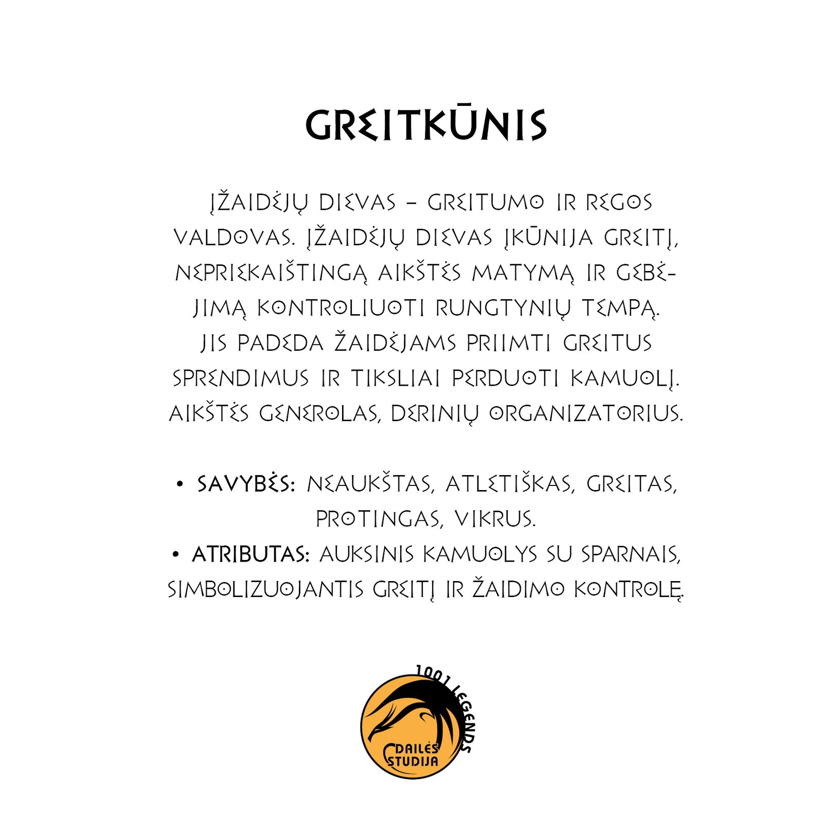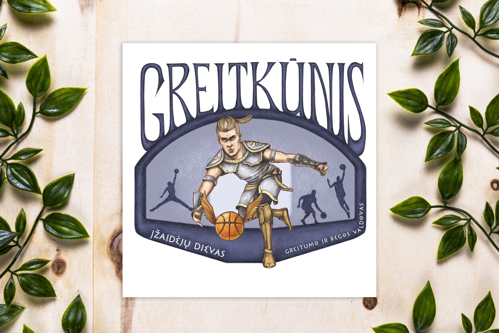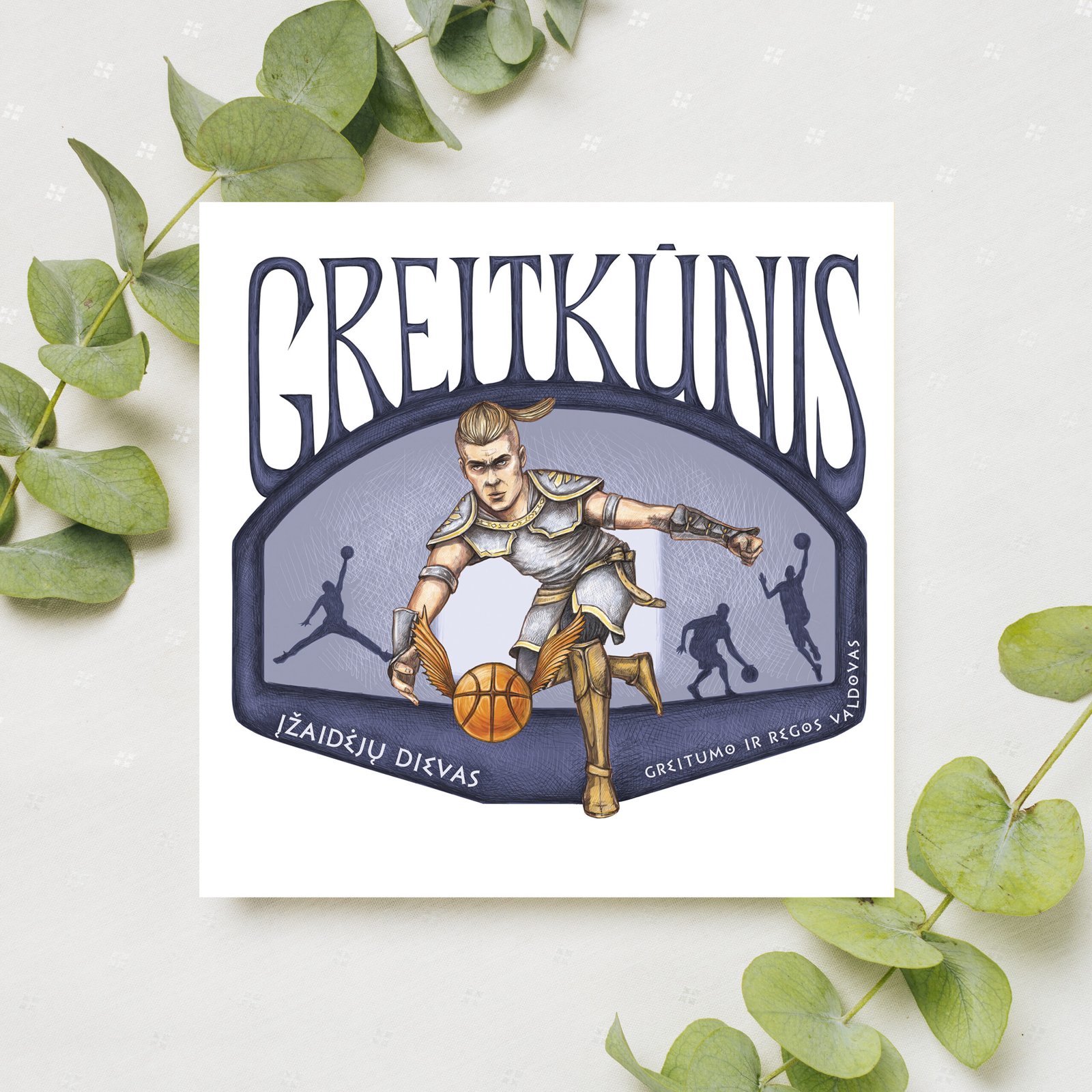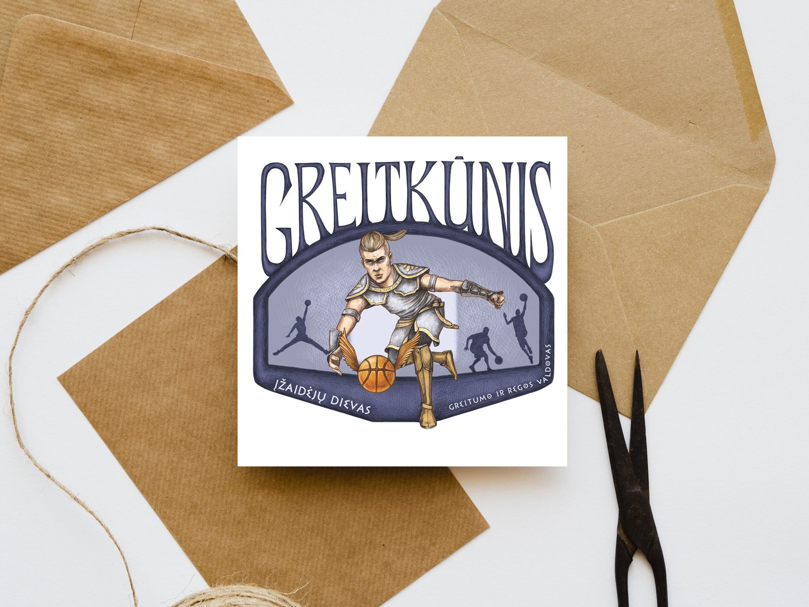 Atvirukas „Greitkūnis” – kvadratinis, atverčiamas 15x15cm dydžio atvirukas su originaliu piešiniu iš serijos ”Krepšinio dievai. Nugarinėje pusėje rasite šio krepšinio dievo aprašymą.