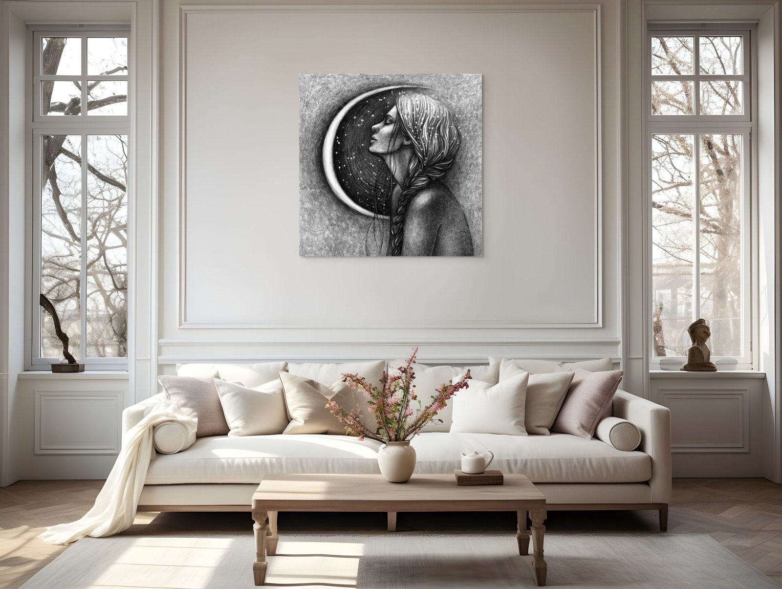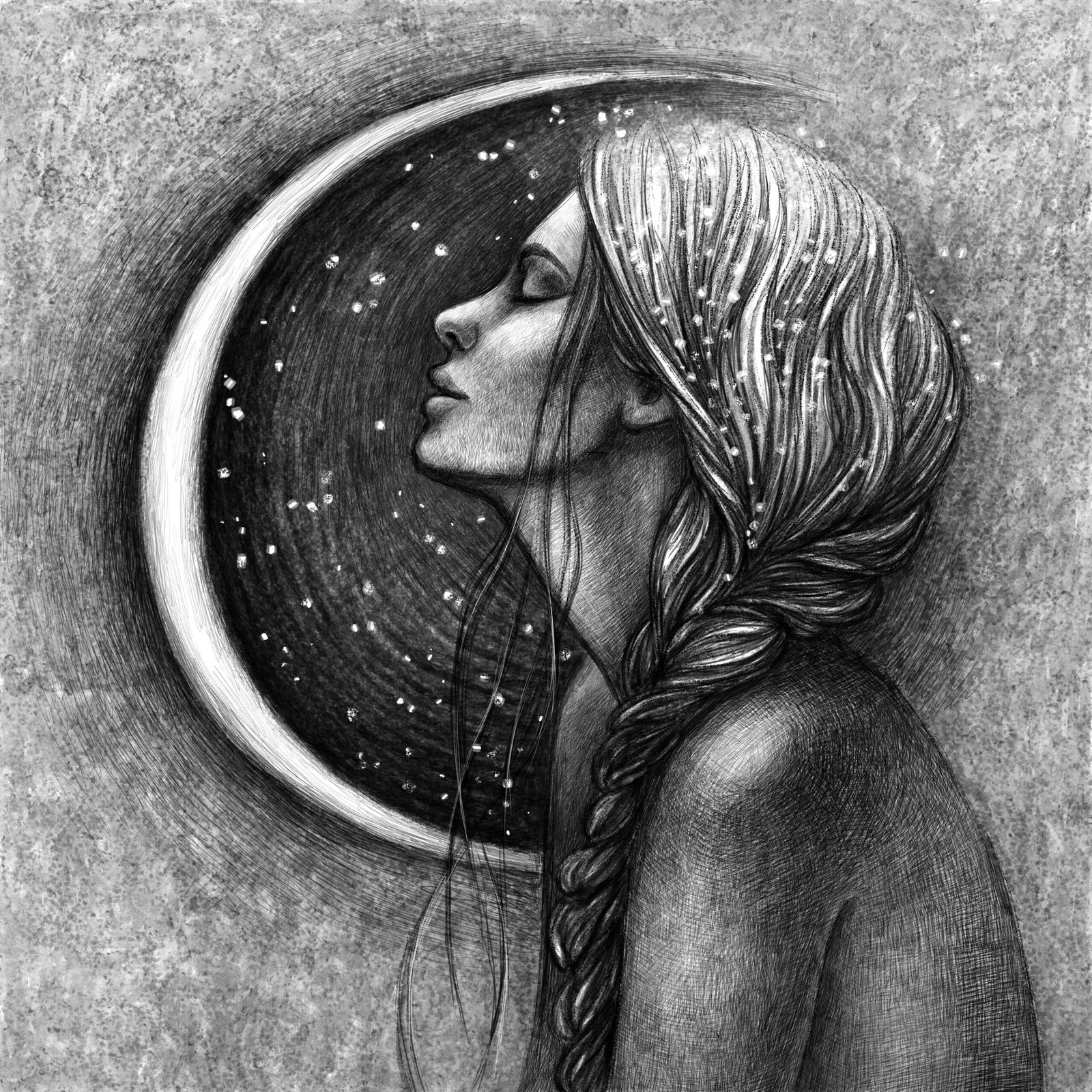 Grafikos darbe Bezlėja interpretuojama kaip susitelkimo ir ramybės būsena. Mėnulio pjautuvas, profilio poza ir subtili šviesos–šešėlio dermė kuria vidinio perėjimo jausmą – momentą, kai diena jau pasitraukė, o naktis dar tik prasideda. Juodai balta technika sustiprina tylą ir laiko sustojimo pojūtį.