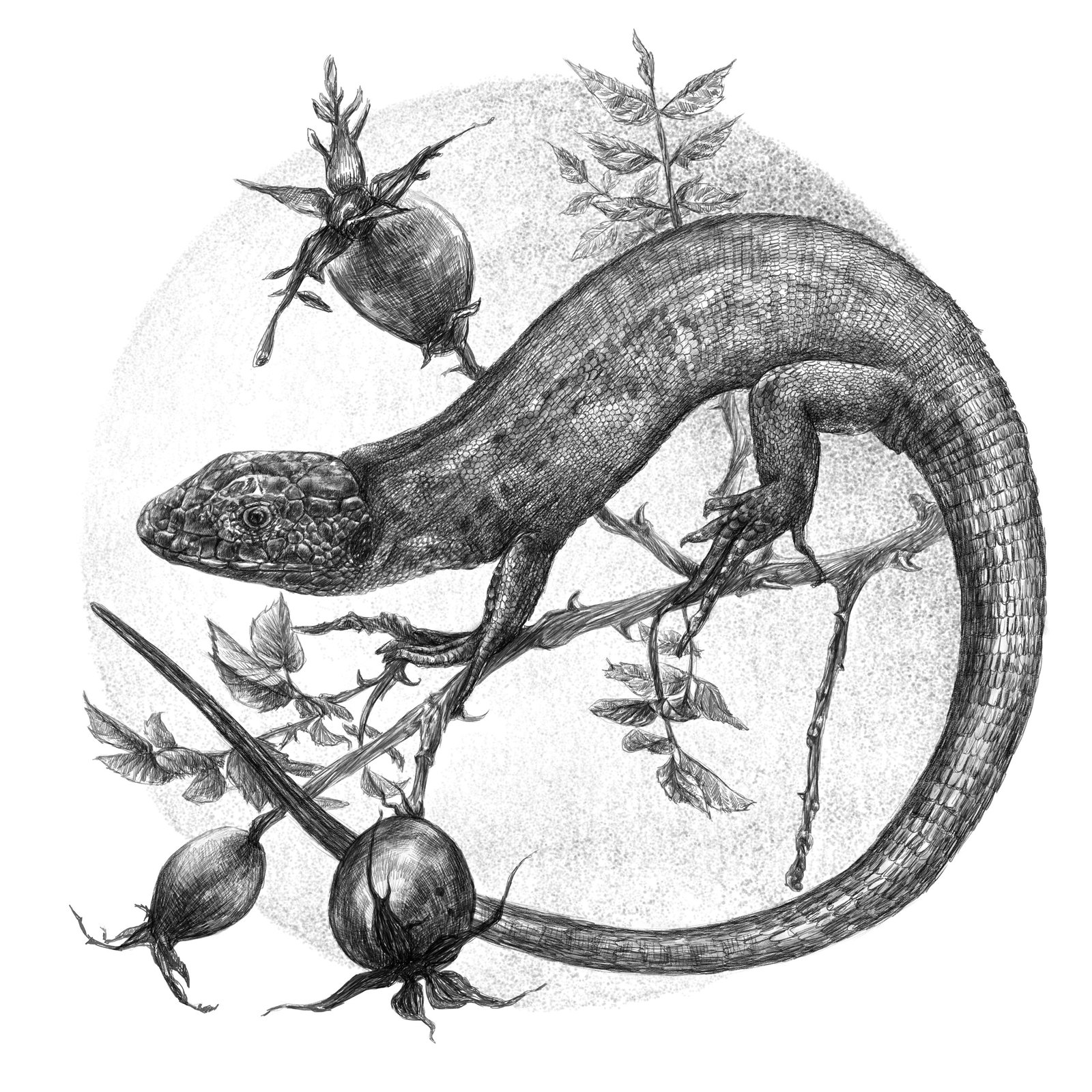 Piešinyje vaizduojamas driežas – trapus, bet kartu stiprus gamtos gyventojas – susilieja su augaliniais motyvais, kurdamas ramų, ciklišką gyvybės vaizdinį. Preciziška linija, kruopšti faktūra ir monochrominė estetika pabrėžia gyvūno formą, judesį ir vidinę įtampą tarp sustingimo ir gyvybės.