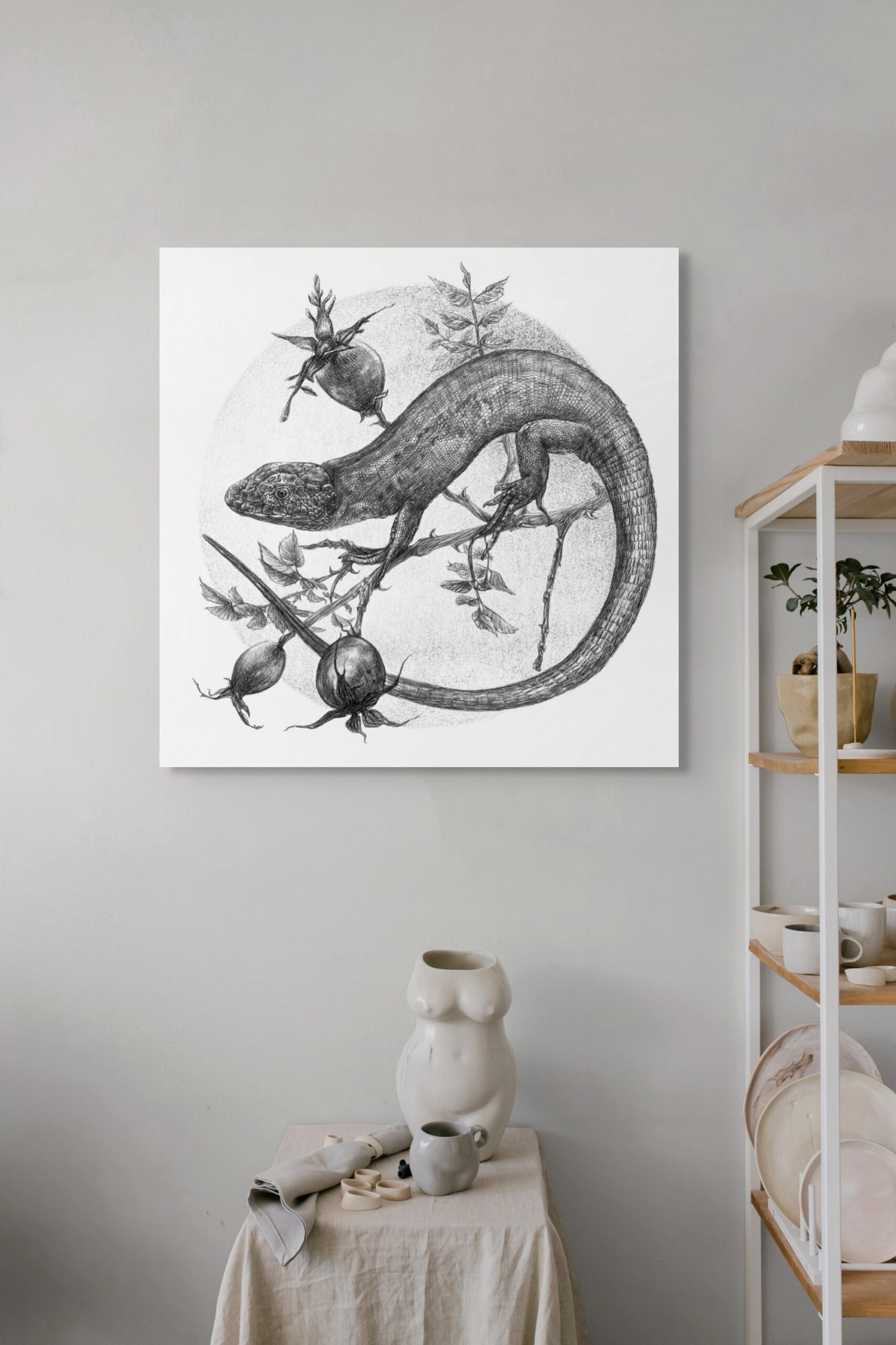Grafikos darbas „Driežas” bus atspaustas ant premium kokybės drobės su porėmiu ir paruošimu kabinimui. Jums tereikia išsirinkti tinkamą dydį.