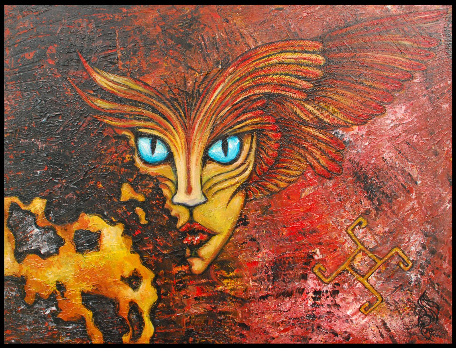 Šiame paveiksle Gabija atskleidžiama per autorinę interpretaciją – kaip budri, aštri, deganti esybė, kurioje susilieja apsauga ir grėsmė. Ryškūs ugnies atspalviai, gyvūniniai bruožai ir simboliniai ženklai kuria įtampą tarp saugumo ir sunaikinimo. Tai ne švelni židinio liepsna, o gyva jėga, kuri stebi ir sprendžia.