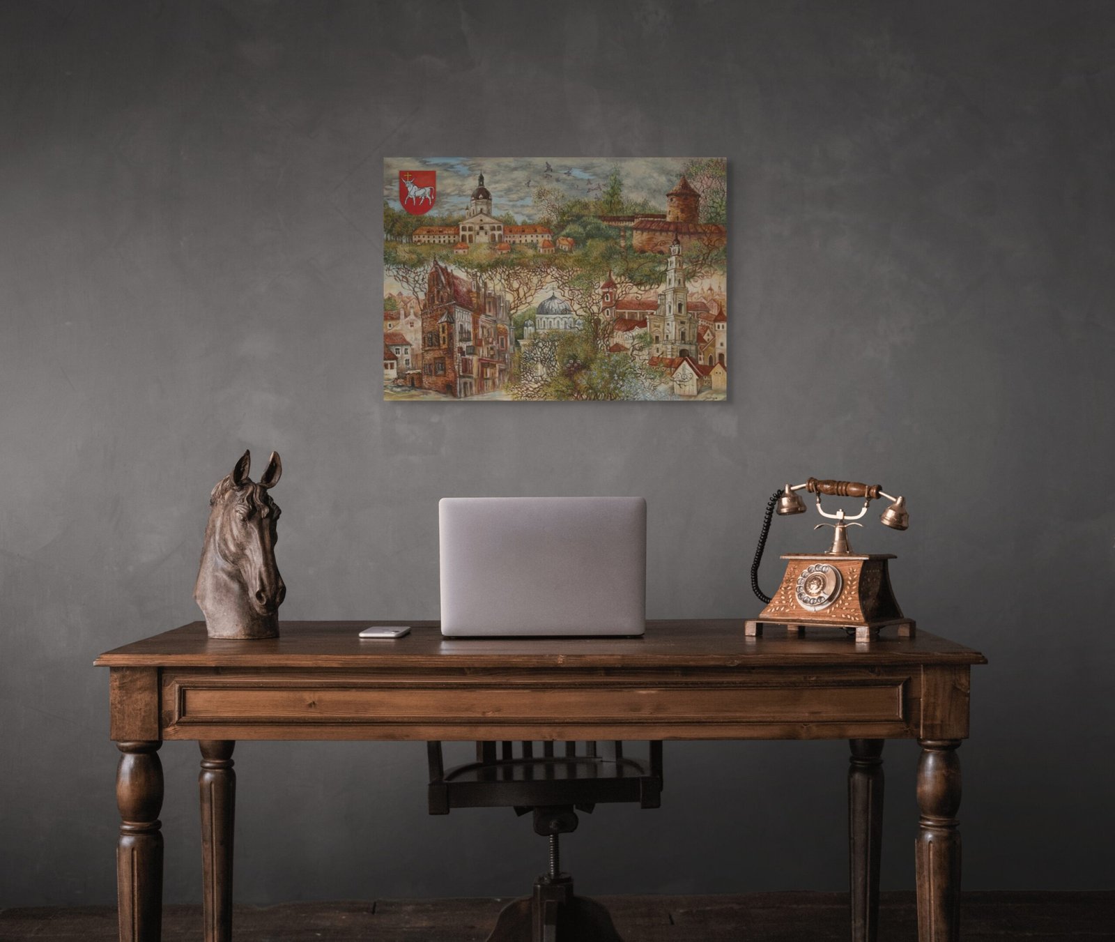 Paveiksle Kaunas atsiskleidžia ne tik kaip geografija, bet ir kaip dvasinė erdvė – vieta, kur susitinka praeitis ir dabartis, sakralumas ir kasdienis miesto ritmas. Šilta spalvų paletė, detalizuoti fragmentai ir švelni, beveik pasakiška atmosfera suteikia kūriniui jaukumo bei ilgaamžiškumo pojūtį.
