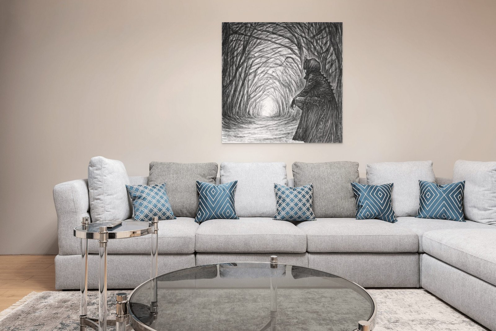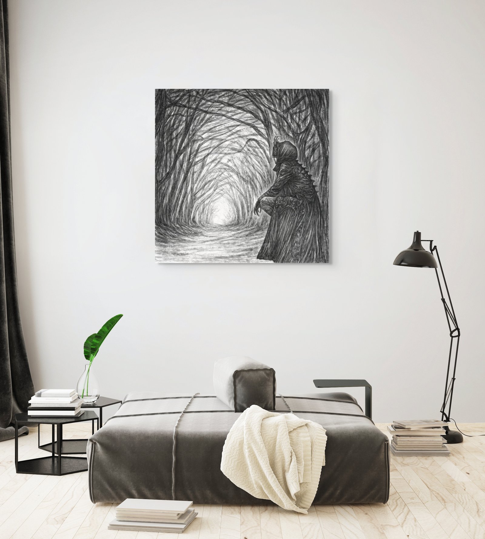 Puikiai dera su ramia spalvų palete ir kryptiniu apšvietimu, leidžiančiu piešiniui „išlįsti“ iš sienos.