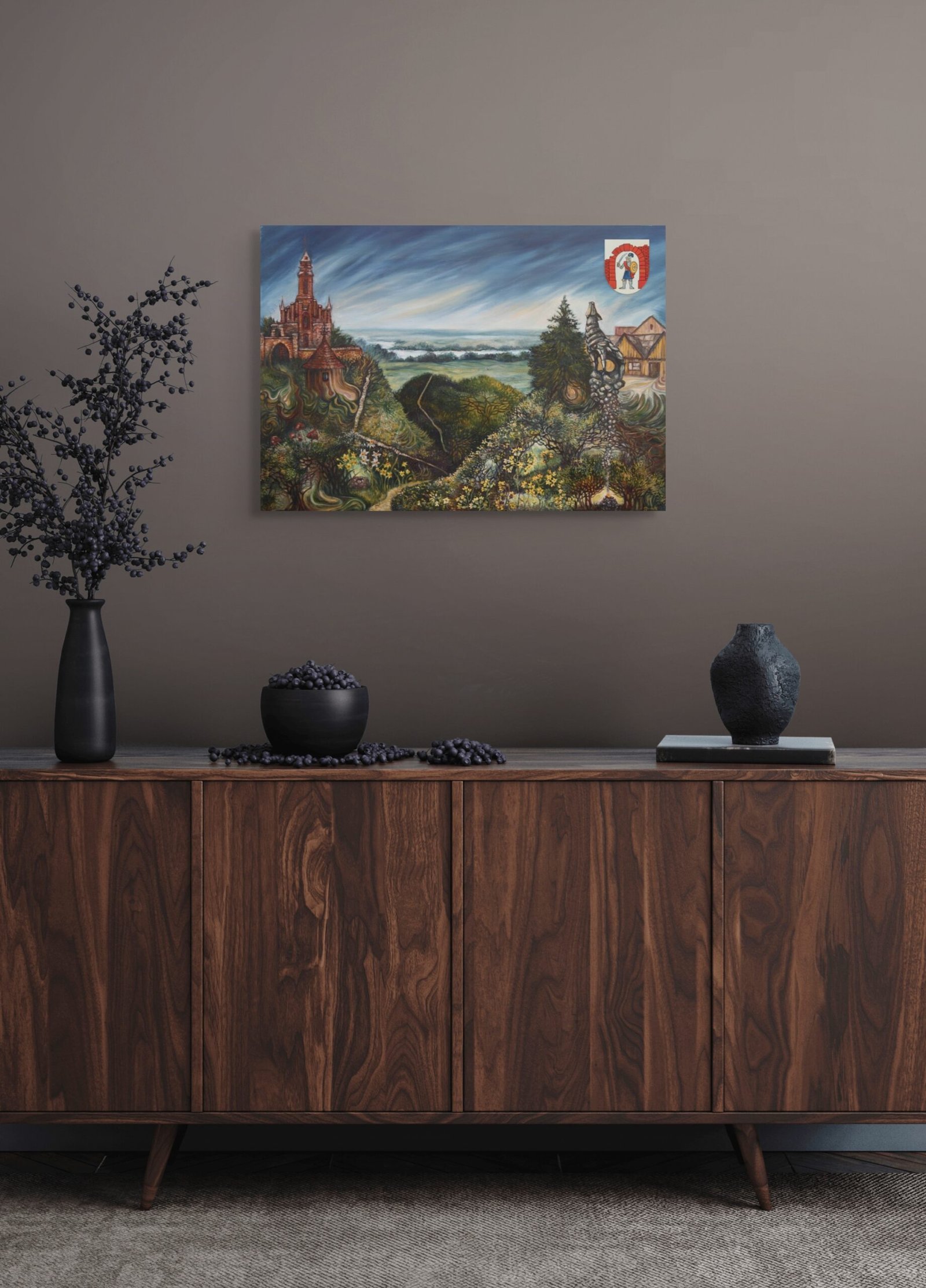 Kompozicijoje dominuoja gamtos ir istorijos dialogas – banguojantis kraštovaizdis, žemės reljefai ir architektūriniai ženklai perteikia vietos sakralumą, tylą ir laiko tėkmę. Švelnūs, bet sodrūs spalviniai perėjimai suteikia kūriniui gylio, o detalės kviečia žiūrovą sustoti ir „skaityti“ paveikslą lėtai, sluoksnis po sluoksnio.