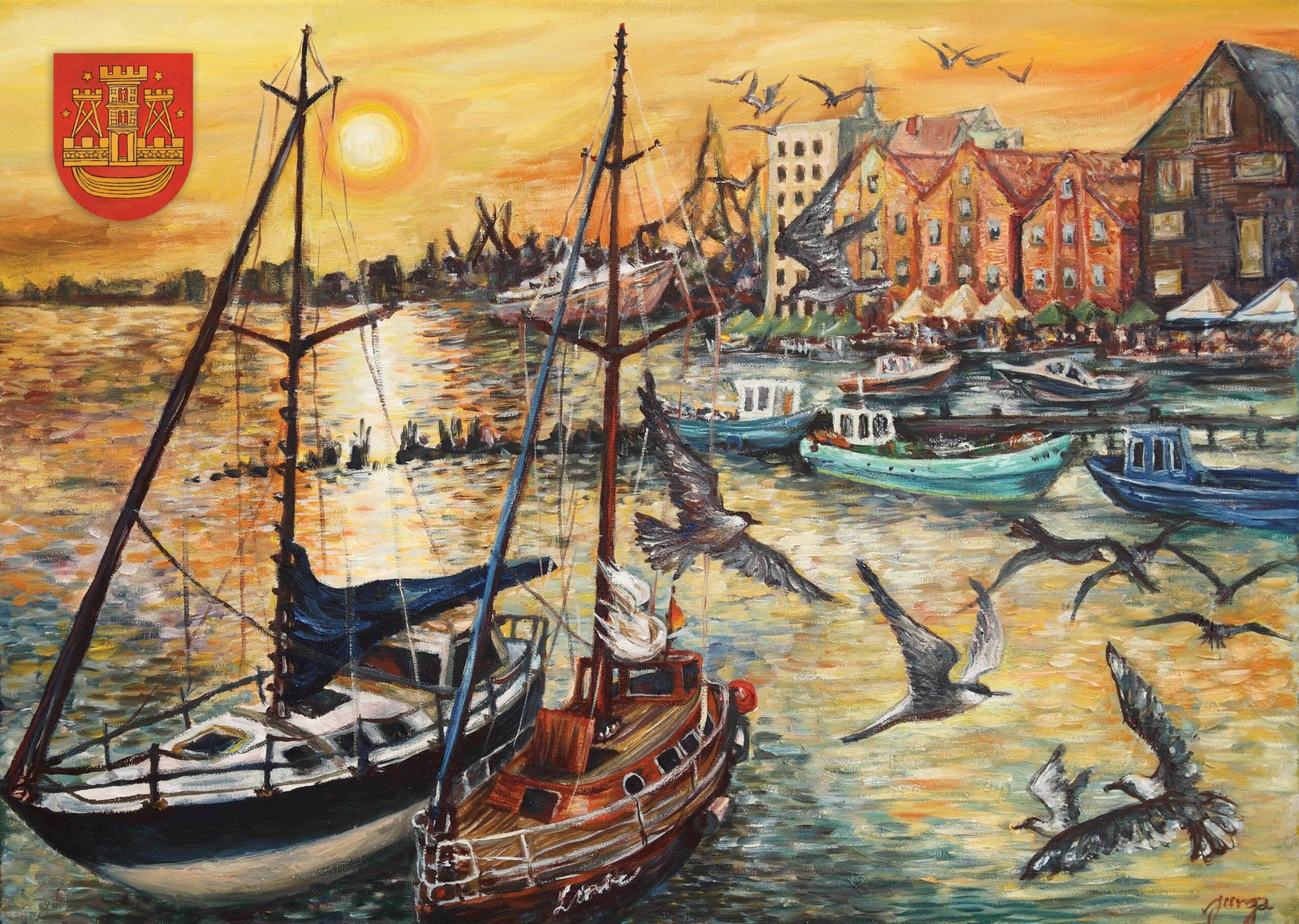 Šiltas, auksinis dangus kontrastuoja su vandens ir laivų faktūromis, o dinamiška kompozicija perteikia miesto gyvybingumą ir jūrinę dvasią. Klaipėda čia vaizduojama kaip miestas, kuriame susitinka gamta ir žmogaus veikla, istorija ir šiandiena, ramybė ir kelionių pažadas.