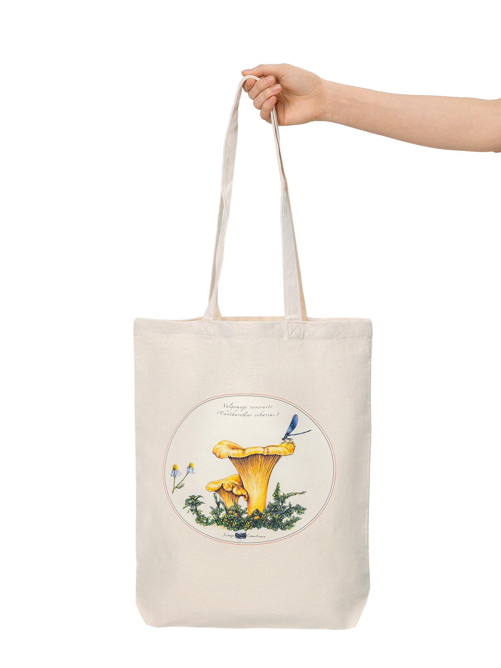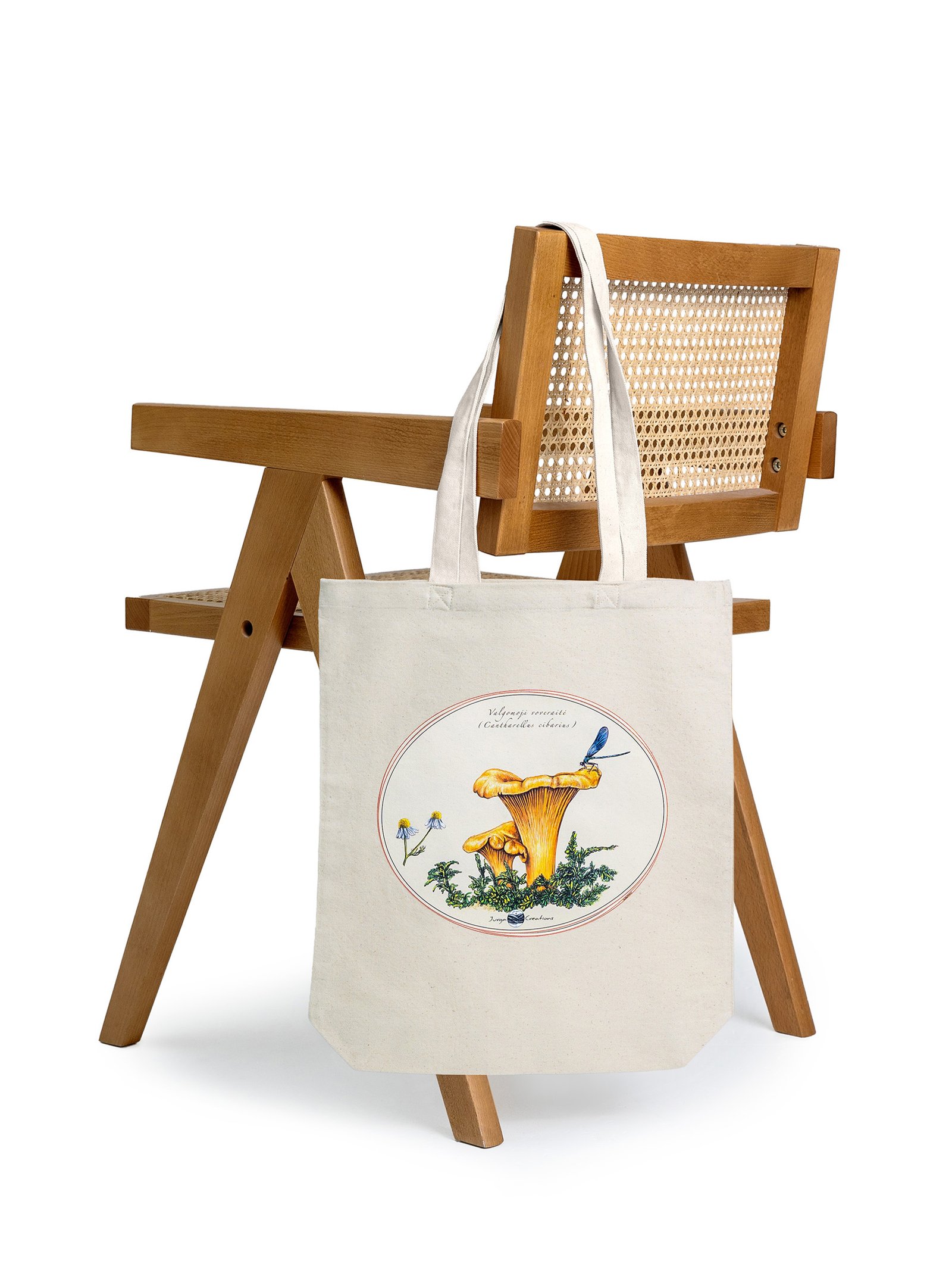 Natūralios spalvos drobinis maišelis dekoruotas autoriniu piešiniu – voveraitė (Cantharellus cibarius), vienu mylimiausių ir lengviausiai atpažįstamų miško grybų. Šiltas geltonas atspalvis ir gyvos detalės sukuria lengvumo ir gyvybės pojūtį – tarsi trumpa akimirka pievoje ar miško pakraštyje.