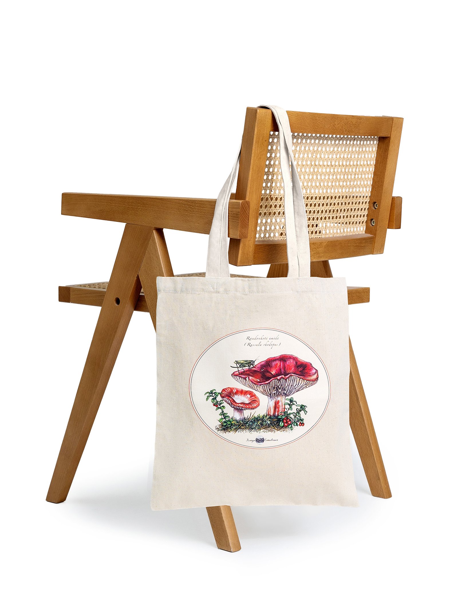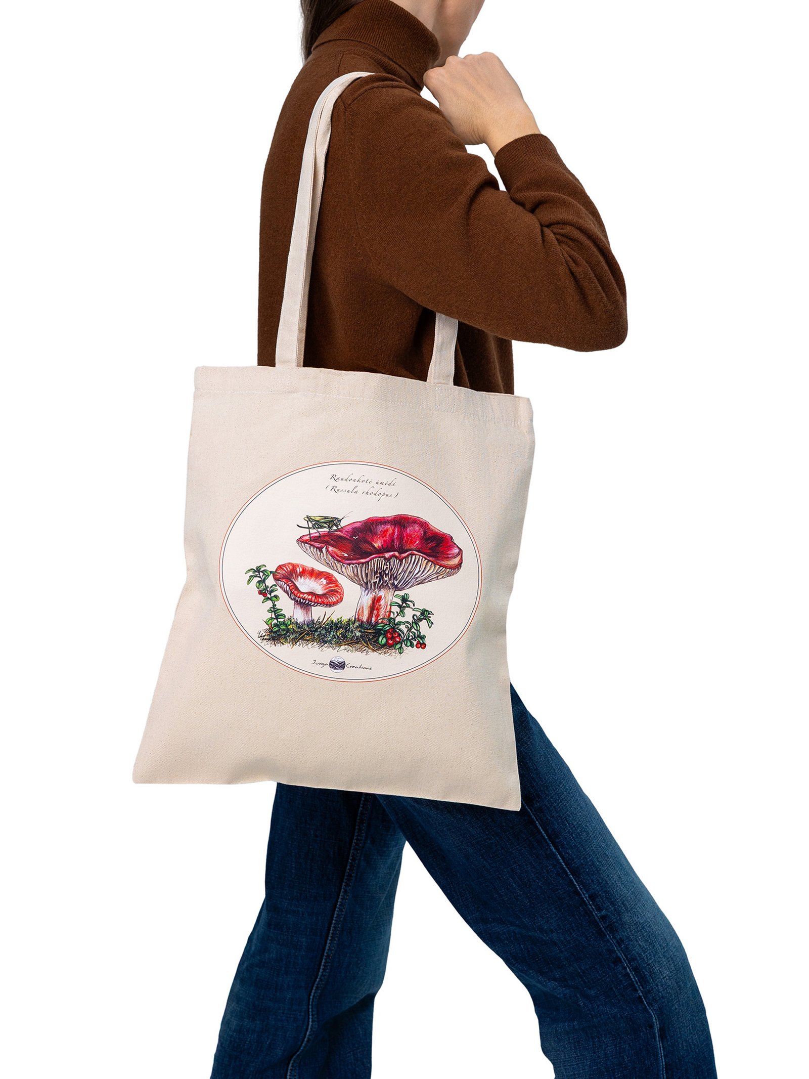 Natūralios spalvos drobinis maišiukas dekoruotas autoriniu piešiniu – raudonkote ūmėde (Russula), išsiskiriančia savo sodria raudona kepurėle ir kontrastingomis detalėmis. Tai grybas, kuris nelieka nepastebėtas – kaip ir šis aksesuaras.