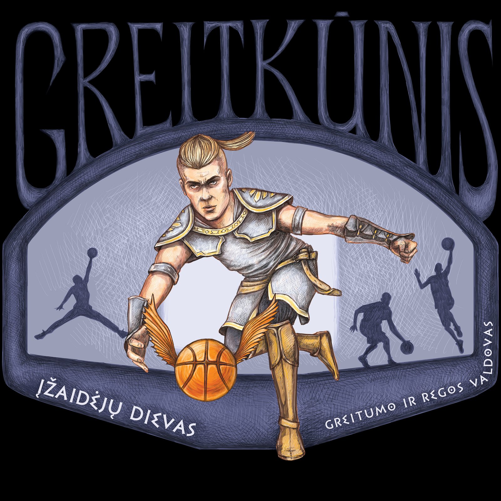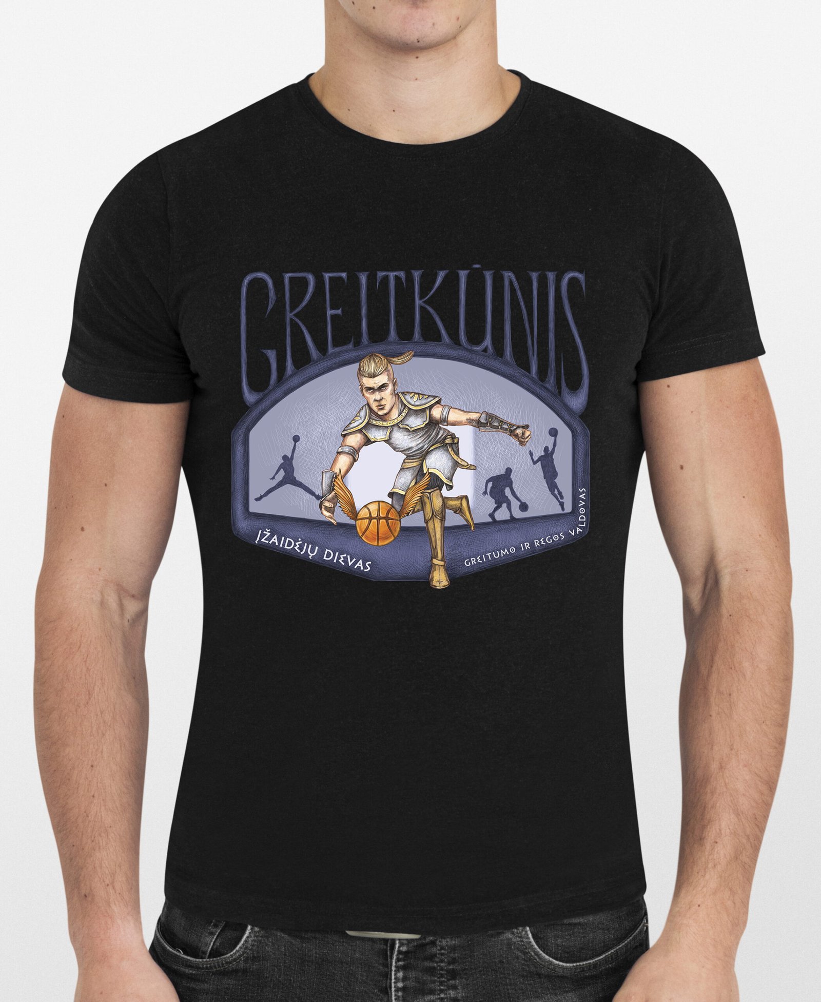Marškinėliai „Greitkūnis“ – storesnės medvilnės marškinėliai su originalaus kūrinio atspaudu iš serijos „Krepšinio dievai“.