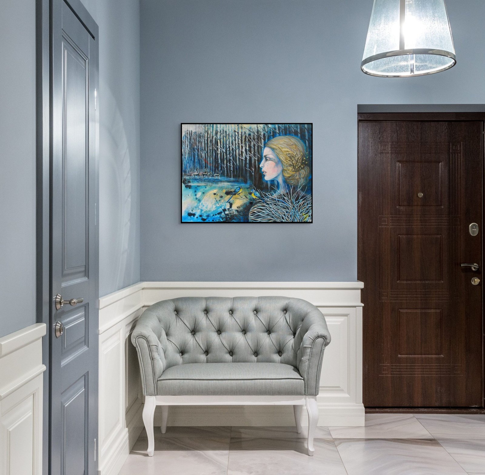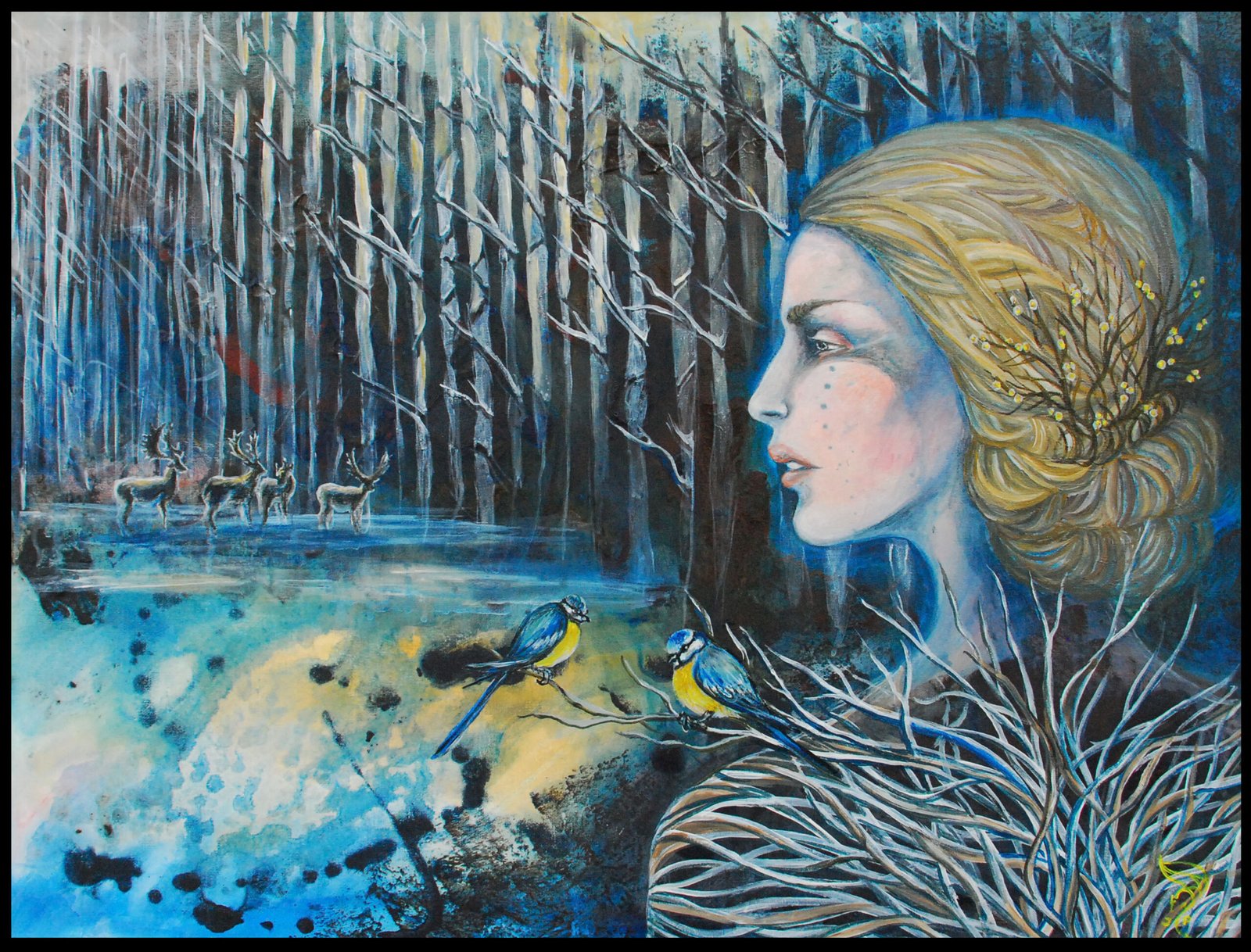 Šiame paveiksle Medeina vaizduojama per autorinę, šiuolaikinę interpretaciją – kaip tylus, budrus buvimas, susiliejantis su miško struktūromis. Žmogaus veidas, gyvūnų figūros, paukščiai ir medžių raizginiai tampa viena visuma. Spalvų gama, primenanti vandenį, šešėlius ir žiemos mišką, kuria jausmą, kad deivė nėra atskira nuo aplinkos – ji yra pats miškas.