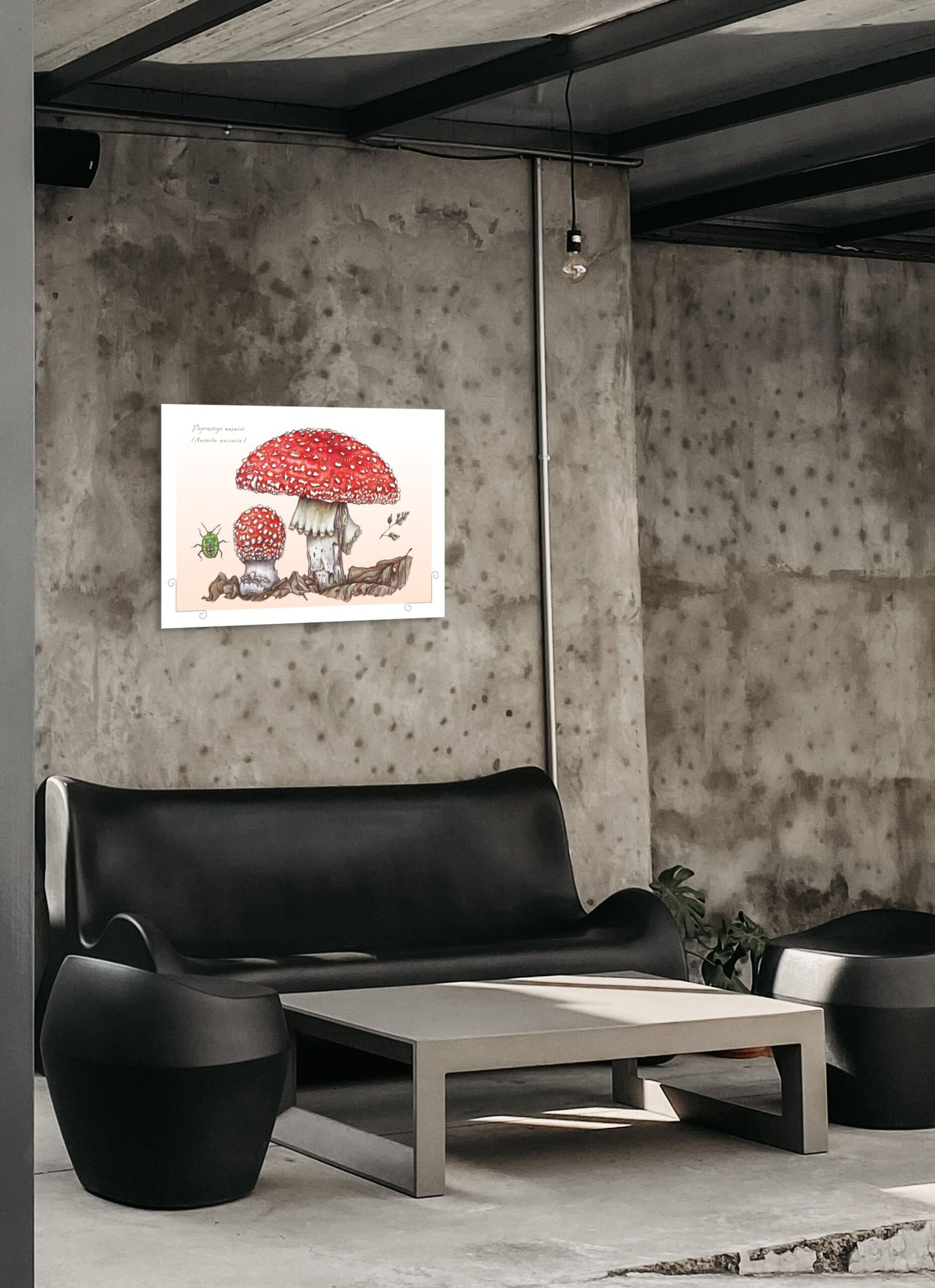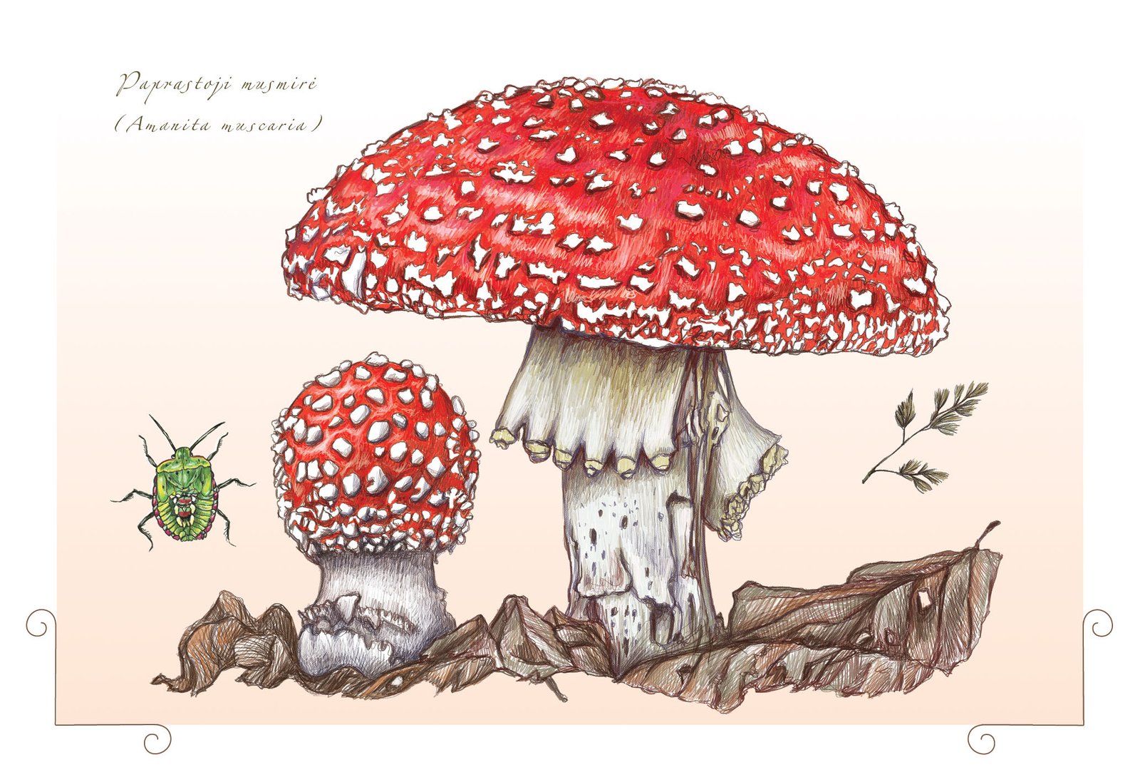 Botaninio stiliaus piešinys, vaizduojantis musmirę – vieną labiausiai atpažįstamų ir simboliškų grybų genčių pasaulyje. Kūrinys sukurtas laikantis mokslinio tikslumo, aiškiai perteikiant kepurėlės formą, paviršiaus struktūrą, lakštelius ir kotą. Prie piešinio pateiktas lotyniškas genties pavadinimas, leidžiantis tiksliai identifikuoti vaizduojamą grybą.