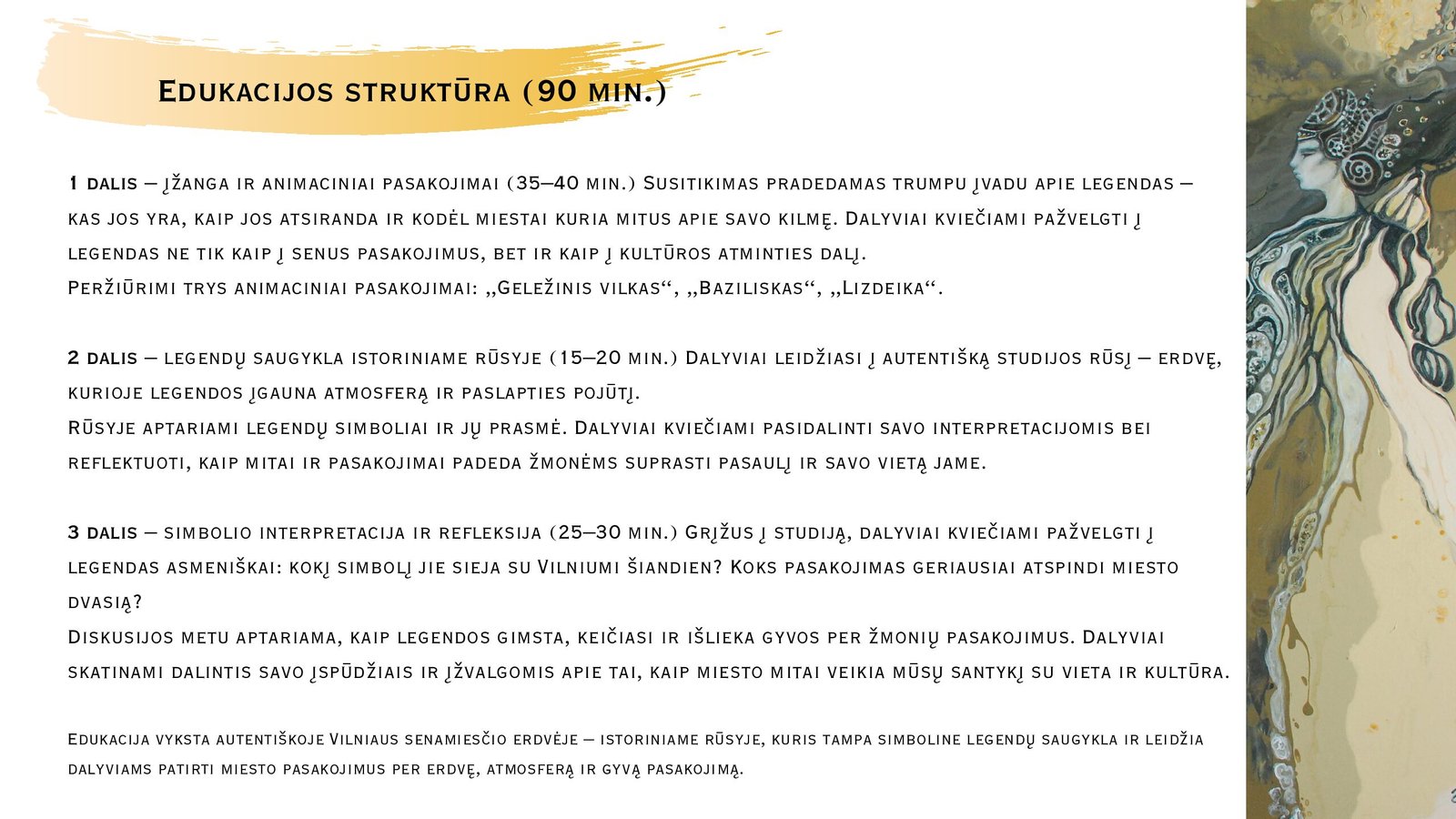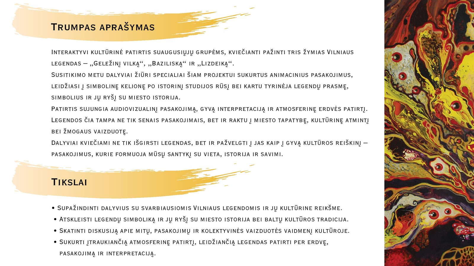 Interaktyvi kultūrinė patirtis suaugusiųjų grupėms, kviečianti pažinti tris žymias Vilniaus legendas – „Geležinį vilką“, „Baziliską“ ir „Lizdeiką“.