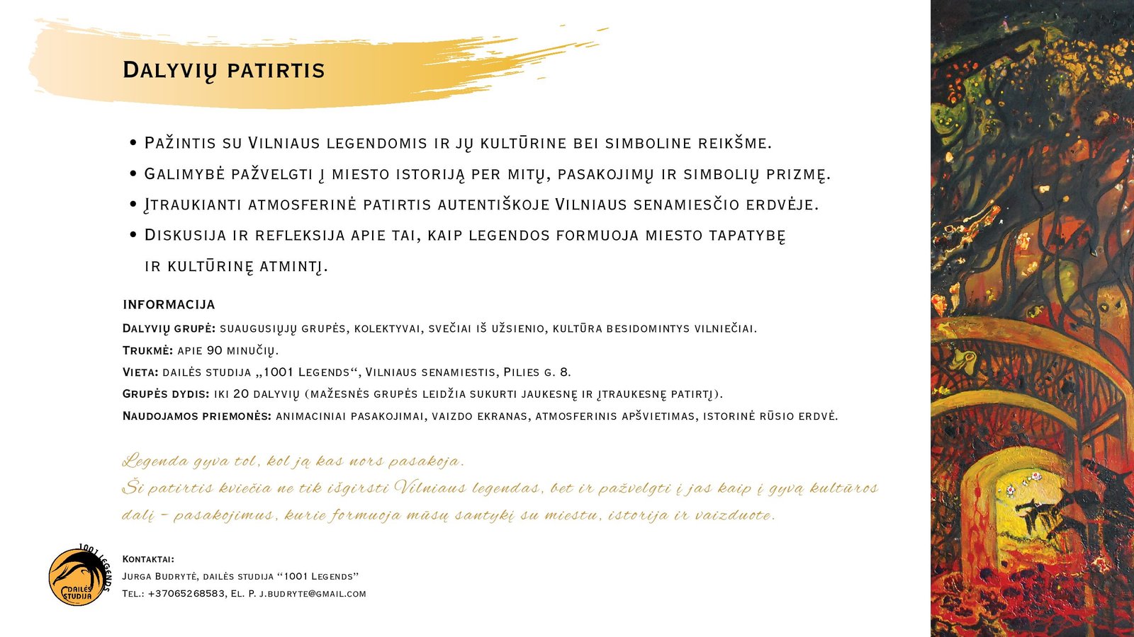 Ši patirtis kviečia ne tik išgirsti Vilniaus legendas, bet ir pažvelgti į jas kaip į gyvą kultūros dalį – pasakojimus, kurie formuoja mūsų santykį su miestu, istorija ir vaizduote.