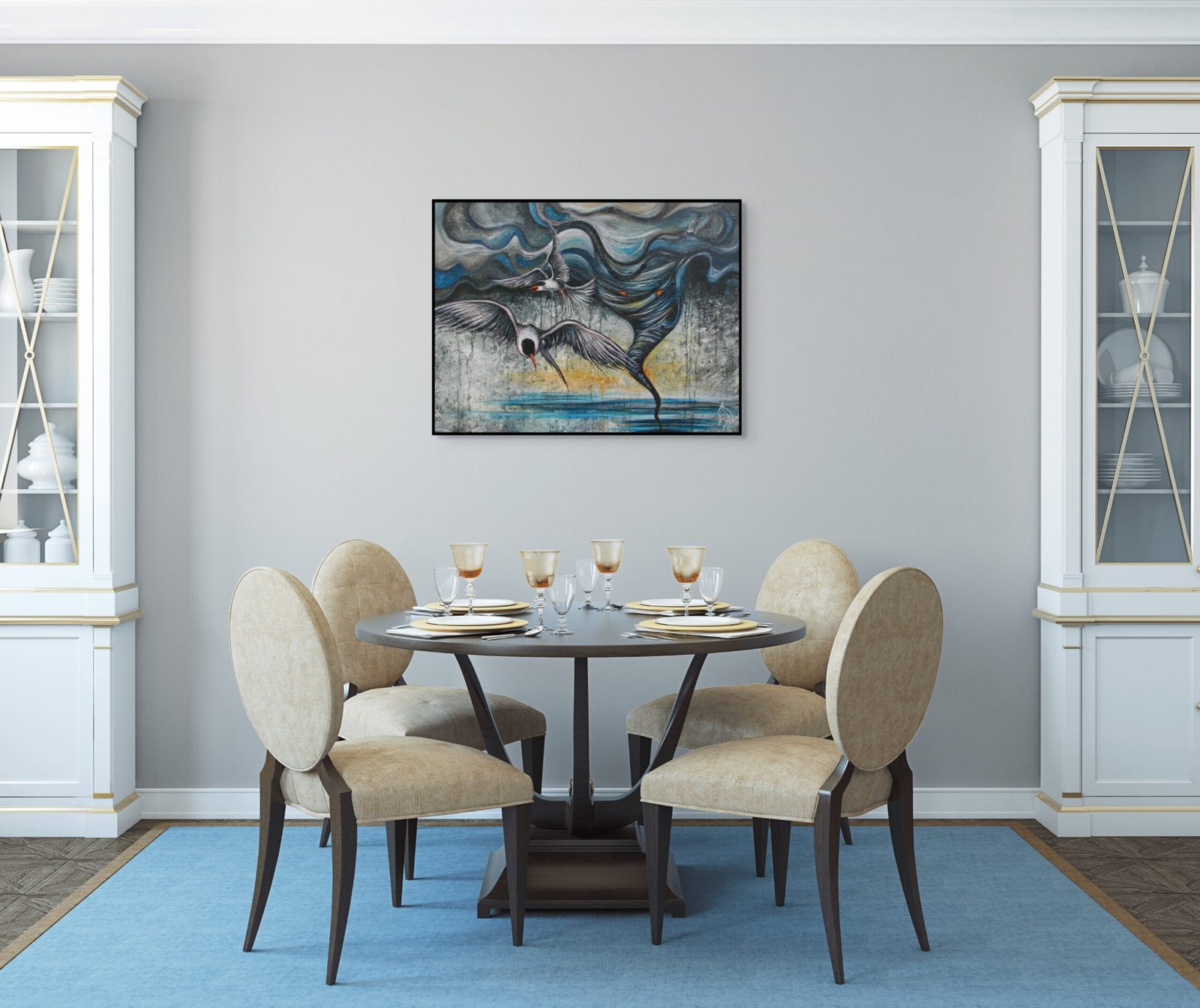 Šiame paveiksle Viesulas vaizduojamas per autorinę, simbolinę interpretaciją – kaip judanti, nestabili jėga, susijungianti su vandeniu, oru ir paukščiais. Sparnų, vėjo ir sūkurio motyvai kuria pojūtį, kad pati erdvė yra iškreipta. Tai ne konkretus pavidalas, o būsena – akimirka prieš lūžį, kai pasaulis dar stovi, bet jau tuoj bus perkeistas.